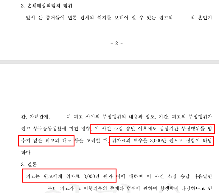 재판부는 남편의 지속적이고 중대한 불륜행위를 인정하며, 이혼하지 않은 상황임에도 불구하고 3,000만원이라는 이례적으로 높은 금액의 위자료 지급을 명령하였습니다.