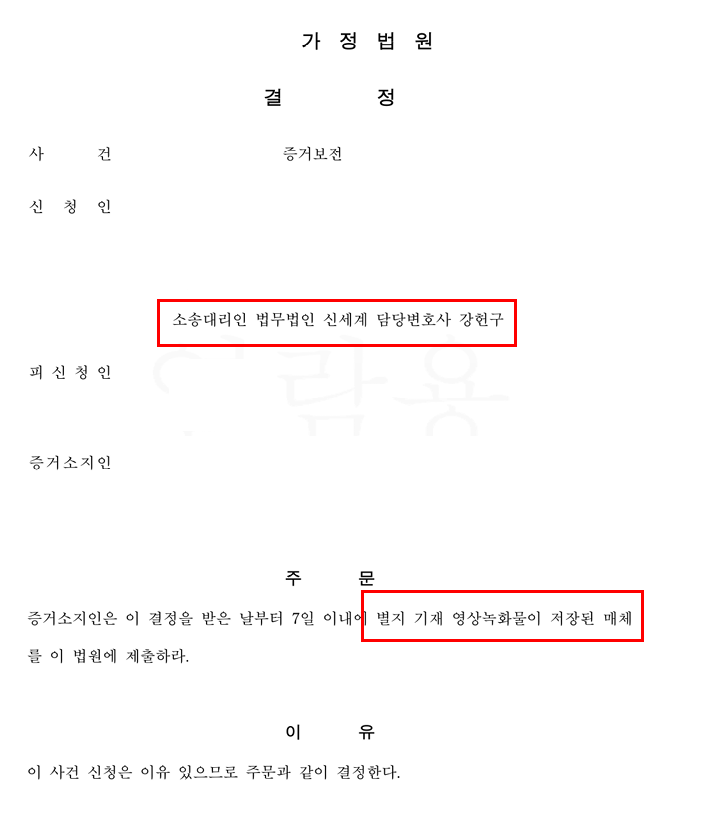 체계적인 준비와 이혼전문변호사의 전문적 대응을 통해 증거보전 결정문을 신속하게 확보할 수 있었습니다. 법원은 증거보전의 필요성과 증거의 존재성을 모두 인정하여 모텔 측에 CCTV 영상 제출을 명령하였고, 이를 통해 결정적인 증거를 안전하게 확보하였습니다.