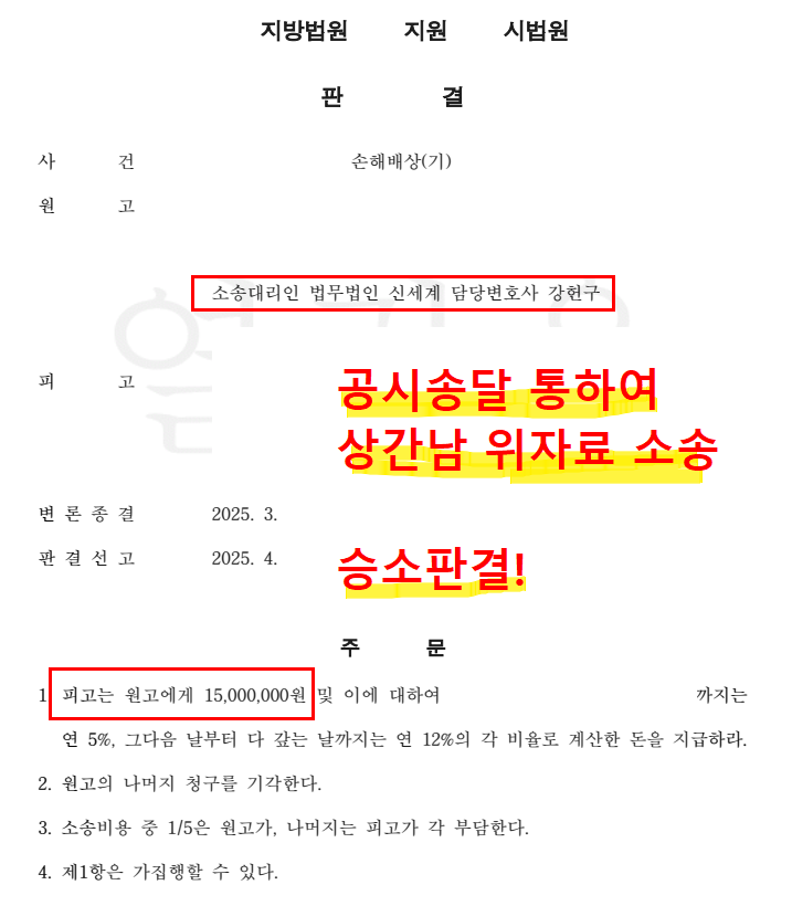 법원은 저희의 신청을 받아들여 공시송달 결정을 내렸고, 이를 통해 소송 절차가 원활히 진행될 수 있었습니다. 결과적으로 법원은 상간남 위자료로 1,500만원을 인정하는 승소 판결을 선고하였습니다.